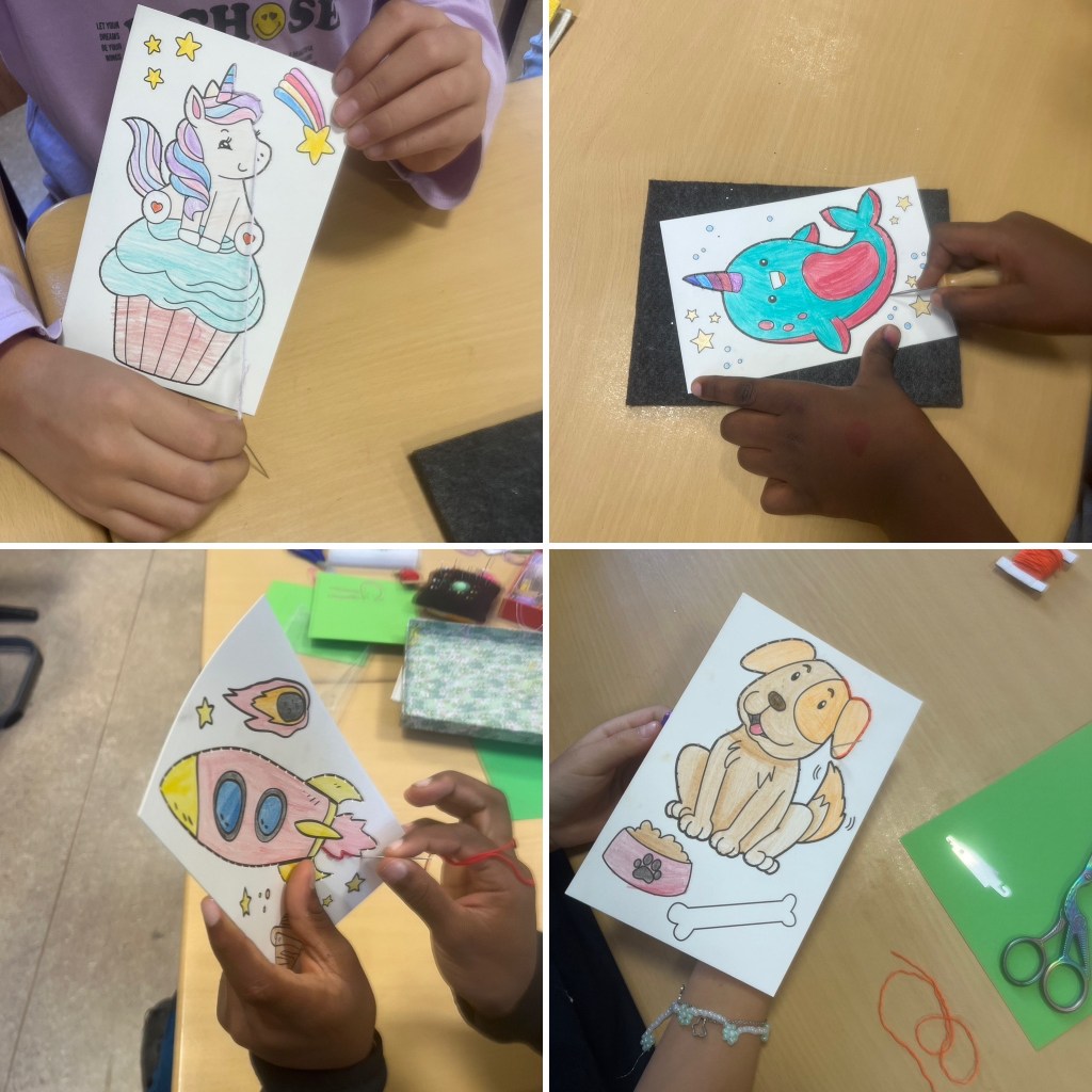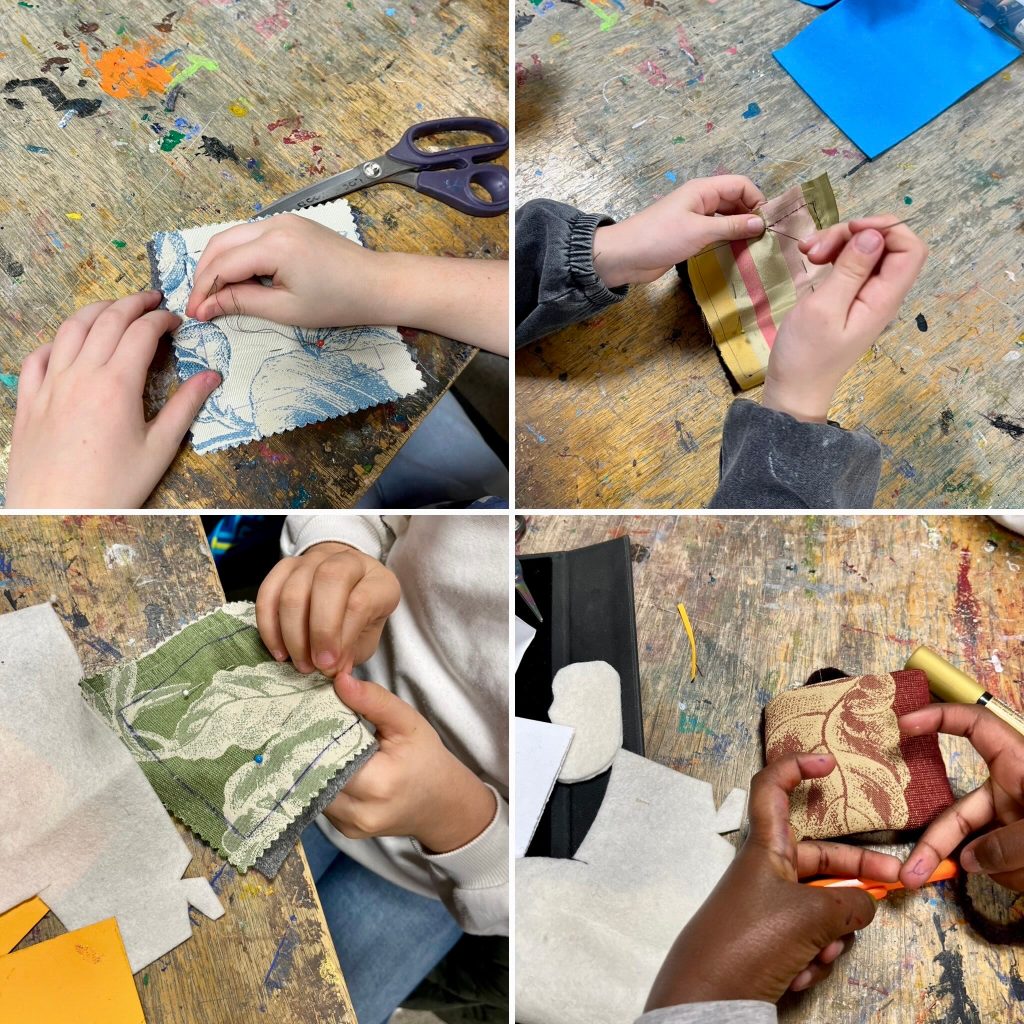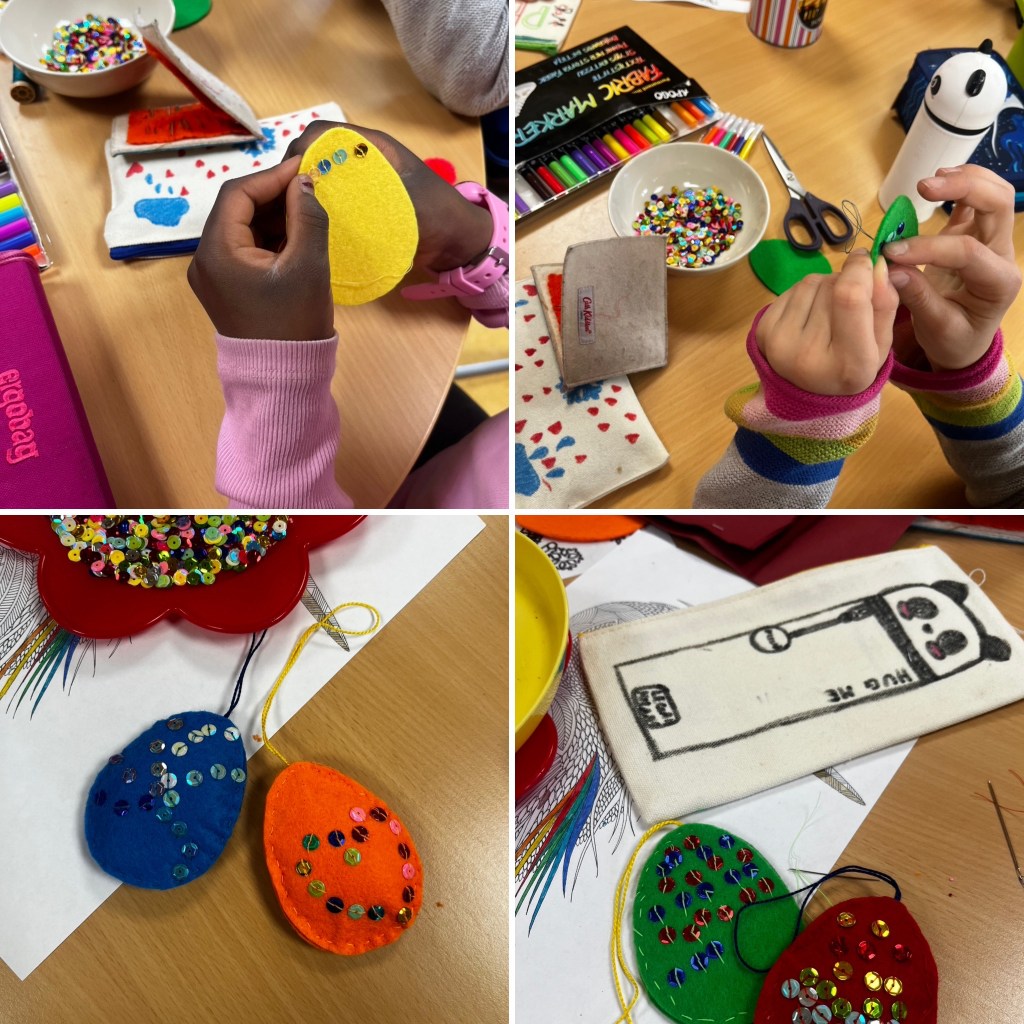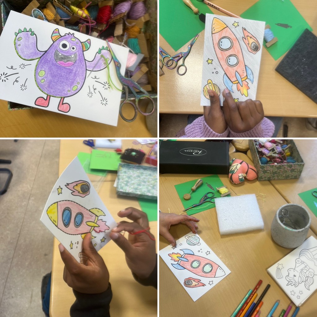 4. Klasse: Arbeit aus dem Atelierangebot (Filzmonsterchen, Stickerei auf Aquarellpapier)