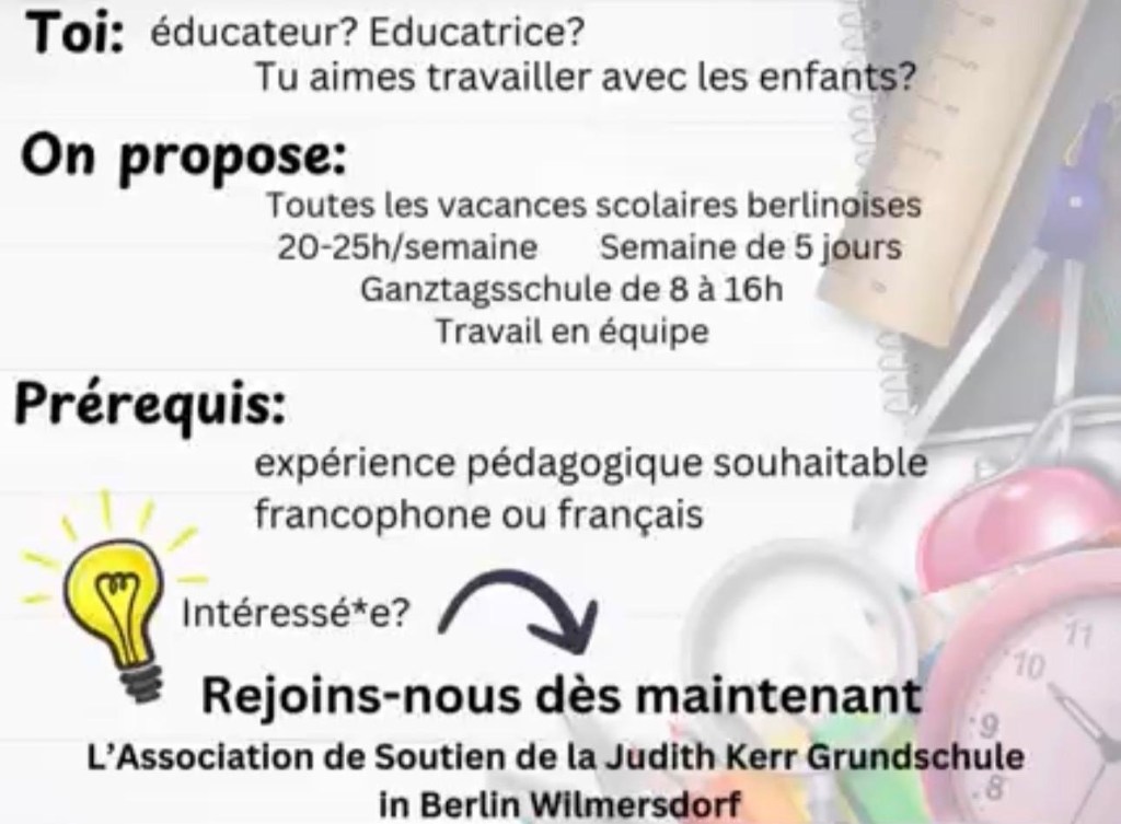 Der Förderverein der Judith-Kerr-Grundschule beschäftigt aktuell 6 frankophone Erzieher*innen (eine Stelle ist noch frei – Siehe Stellangebot unten), die dem Senats-Team zur Seite stehen und unseren Kindern eine ganztägige Betreuung in französischer Sprache ermöglichen. Hier stellen sie sich vor: